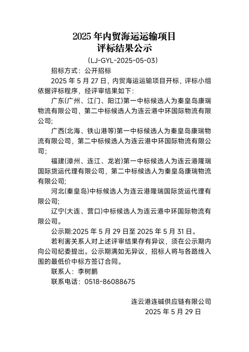 連云港連堿供應(yīng)鏈有限公司2025年內(nèi)貿(mào)海運(yùn)運(yùn)輸項(xiàng)目評(píng)標(biāo)結(jié)果公示
