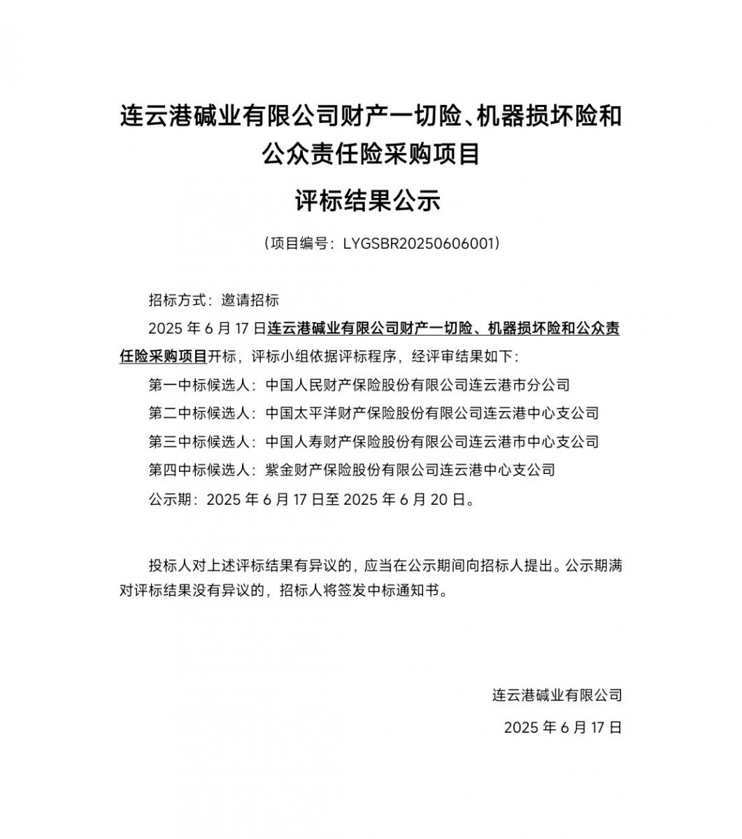 連云港堿業(yè)有限公司財產(chǎn)一切險、機器損壞險和公眾責(zé)任險采購項目評標結(jié)果公示