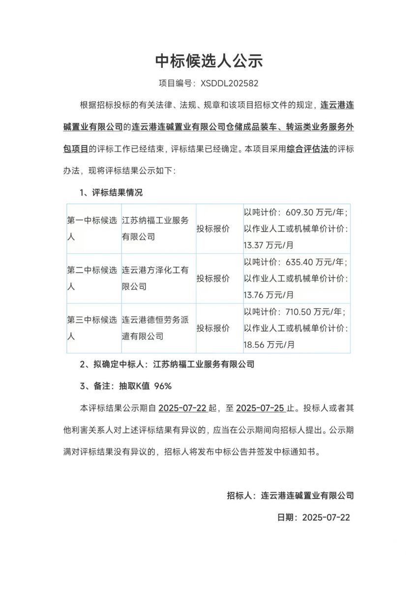 連云港連堿置業(yè)有限公司倉儲成品裝車、轉運類業(yè)務服務外包項目中標候選人公示