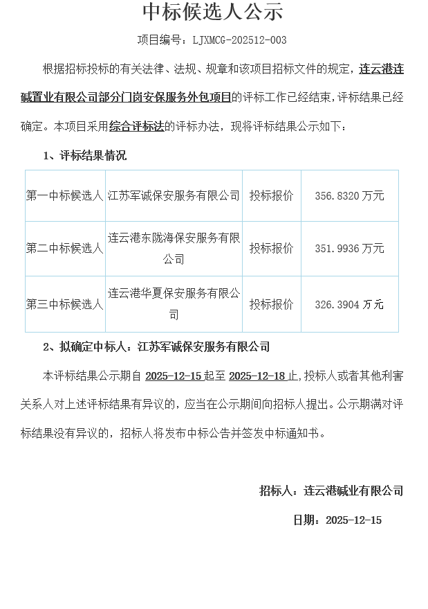 連云港連堿置業(yè)有限公司部分門崗安保服務(wù)外包項目中標(biāo)候選人公示