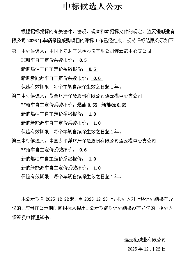 連云港堿業(yè)有限公司2026年車(chē)輛保險(xiǎn)采購(gòu)項(xiàng)目中標(biāo)候選人公示