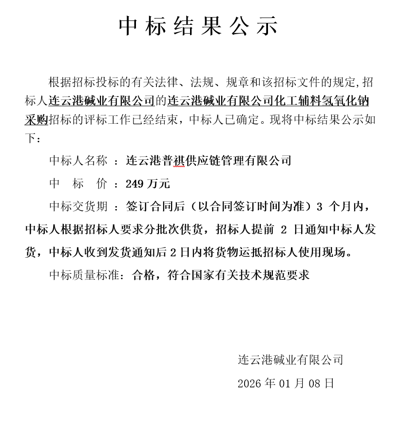 連云港堿業(yè)有限公司化工輔料氫氧化鈉采購(gòu)中標(biāo)結(jié)果公示