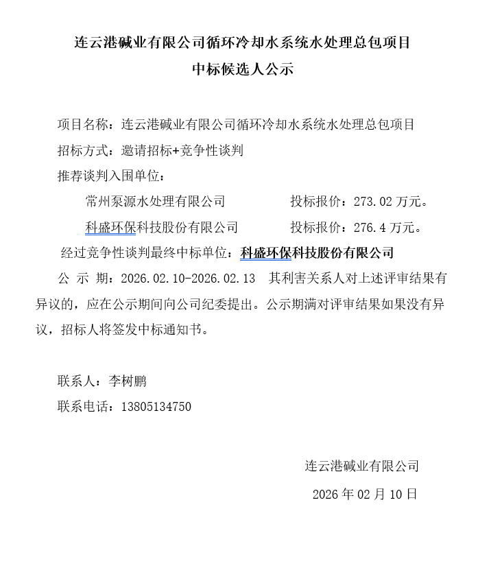 連云港堿業(yè)有限公司循環(huán)冷卻水系統(tǒng)水處理總包項目中標候選人公示