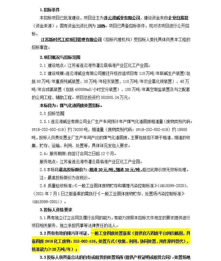 連云港堿業(yè)有限公司煤氣化渣固廢處置二次招標(biāo)公告