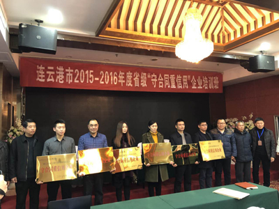 12月11日下午,連云港市2015-2016年度省級(jí)“守合同重信用”企業(yè)培訓(xùn)班在明珠大酒店舉行,會(huì)議進(jìn)行了授牌儀式,我公司榮獲省級(jí)“守合同重信用”單位。