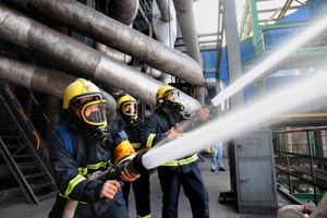 公司黨委書記、董事長張衛(wèi)民,黨委副書記、總經(jīng)理李清菊,副總經(jīng)理焦旺盛參加演練并提要求。健康安全環(huán)保部消防隊、熱電車間抽調精兵強將參加這次突發(fā)事件應急預案實戰(zhàn)演練。