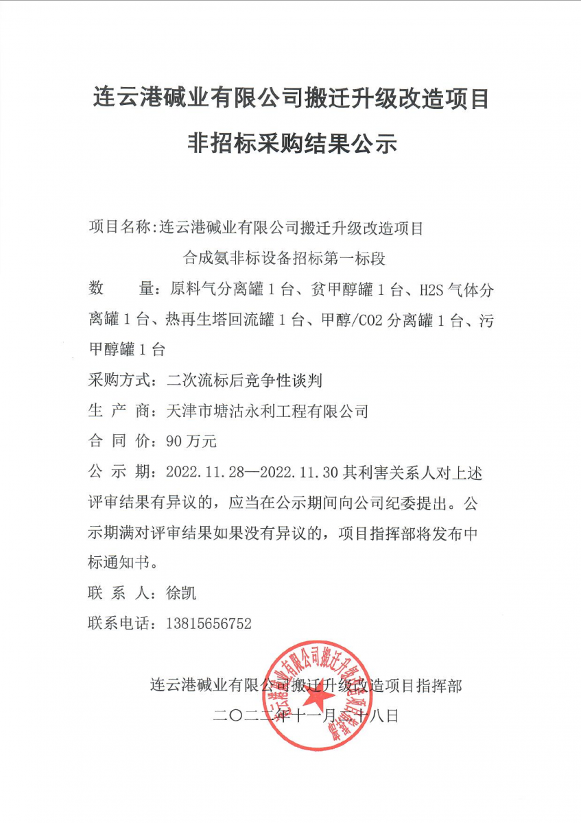 合成氨非標設備招標第一標段非標采購結果公示