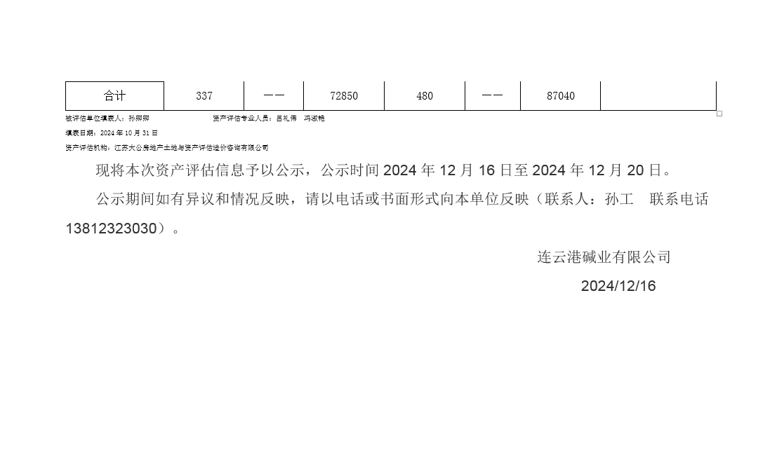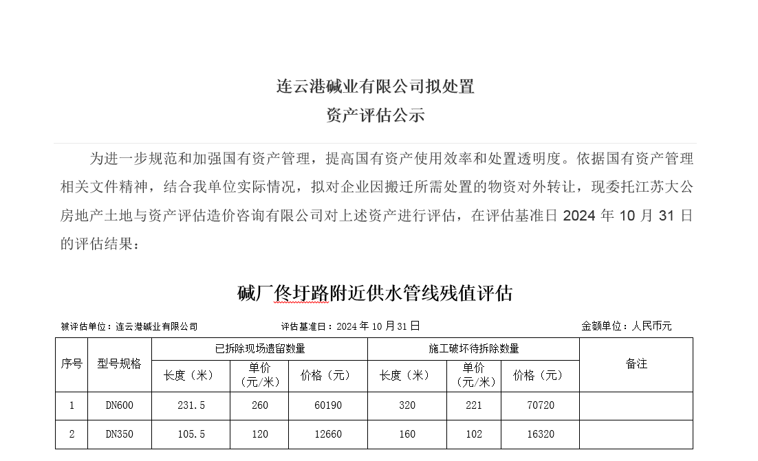 連云港堿業(yè)有限公司佟圩路附近供水管線資產評估公示