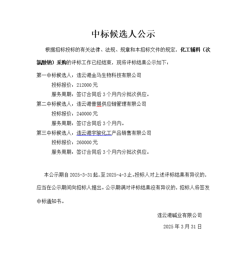 化工輔料次氯酸鈉采購中標(biāo)候選人公示